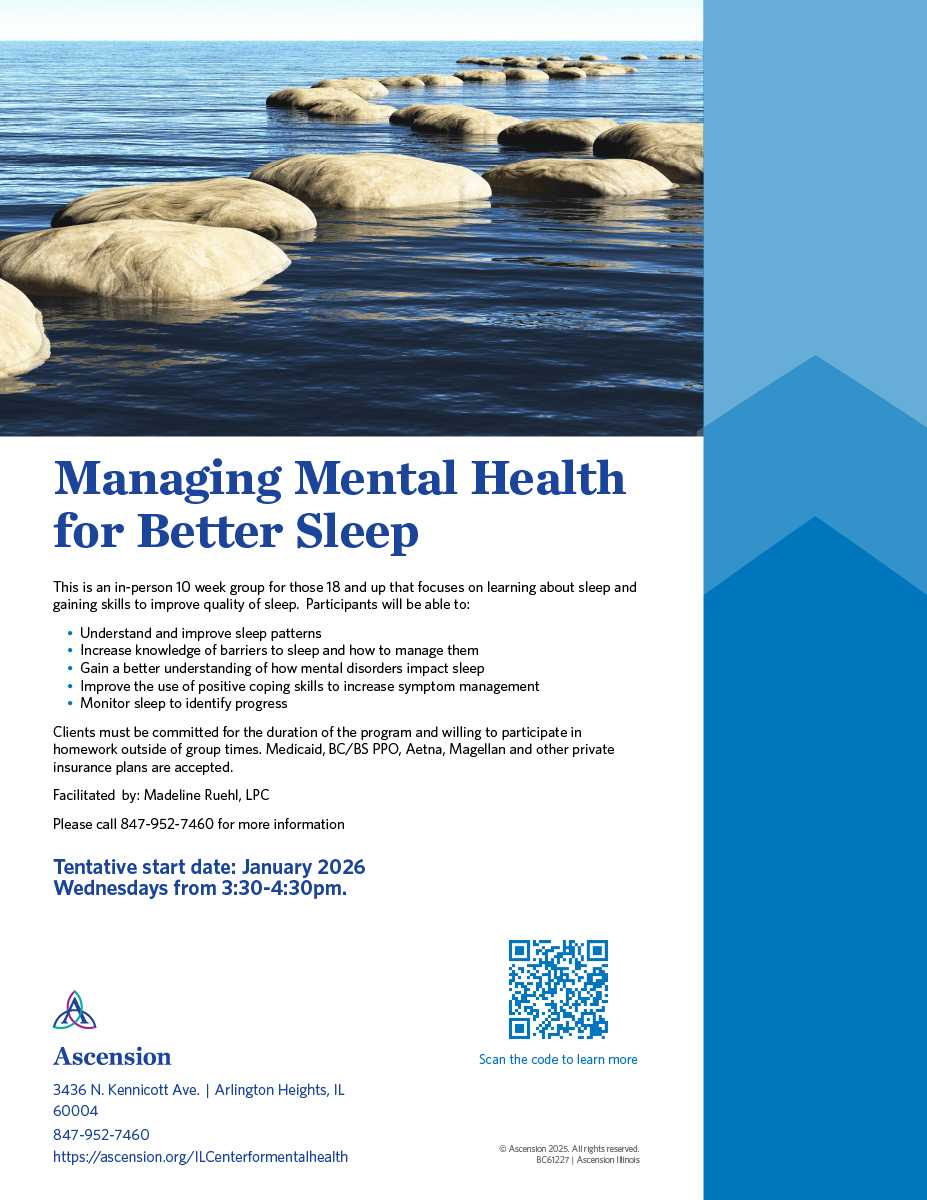 Ascension Illinois Center for Mental Health Arlington Heights also provides group therapy programs to help you connect with counselors and get the care you need for dialectical behavioral therapy, mental health sleep therapy, and psycho-educational women's therapy.